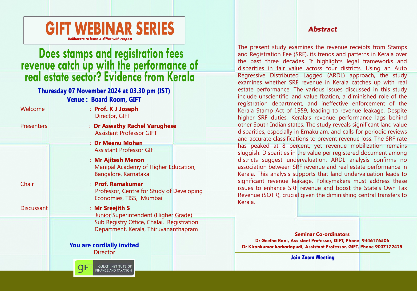 07-11-2024: Seminar on Does stamps and registration fees revenue catch up with the performance of real estate sector? “Evidence from Kerala”
