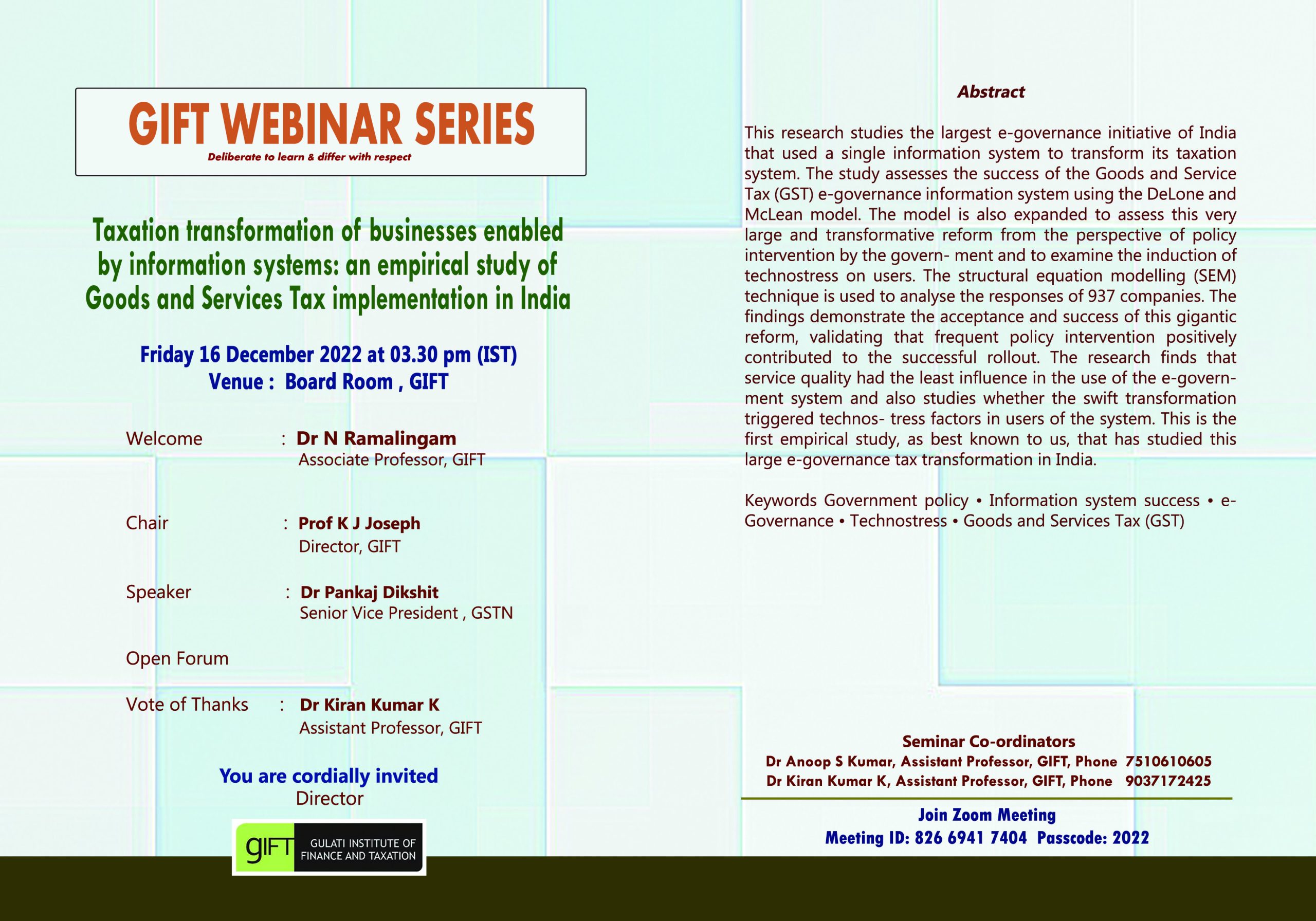 16.12.2022:Webinar on “Taxation transformation of businesses enabled by information systems: an empirical study of Goods and Services Tax implementation in India”
