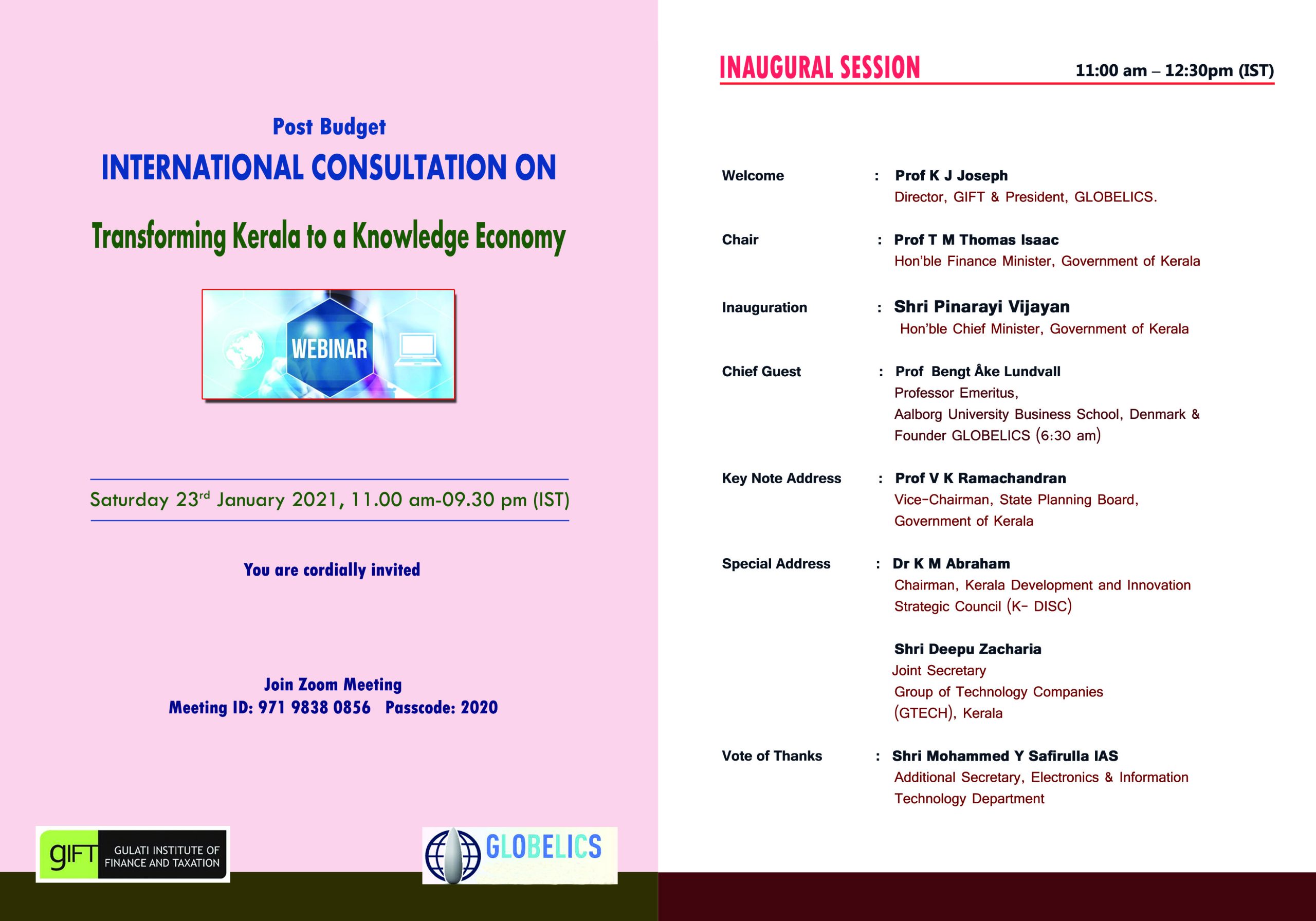 23.01.2021 : Webinar on Post Budget International Consultation on Transforming Kerala to a Knowledge Economy