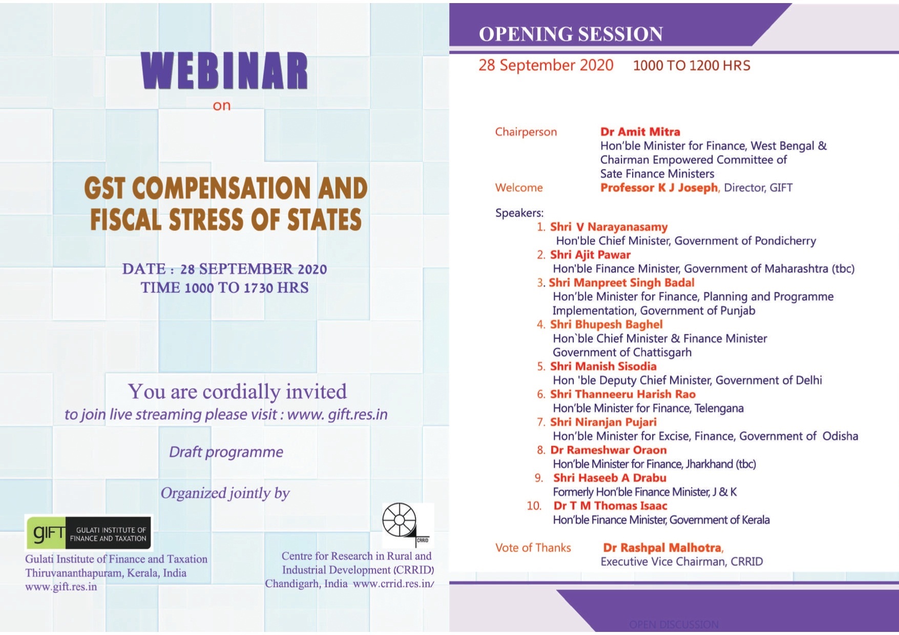 This webinar jointly organized by Gulati Institute of Finance and Taxation (GIFT), Thiruvananthapuram and Centre for Research in Rural and Industrial Development (CRRID) Chandigarh intends to provide a forum for deliberating on implications of the Centre’s proposal on the already stressed state finances and articulate the responses of the states.